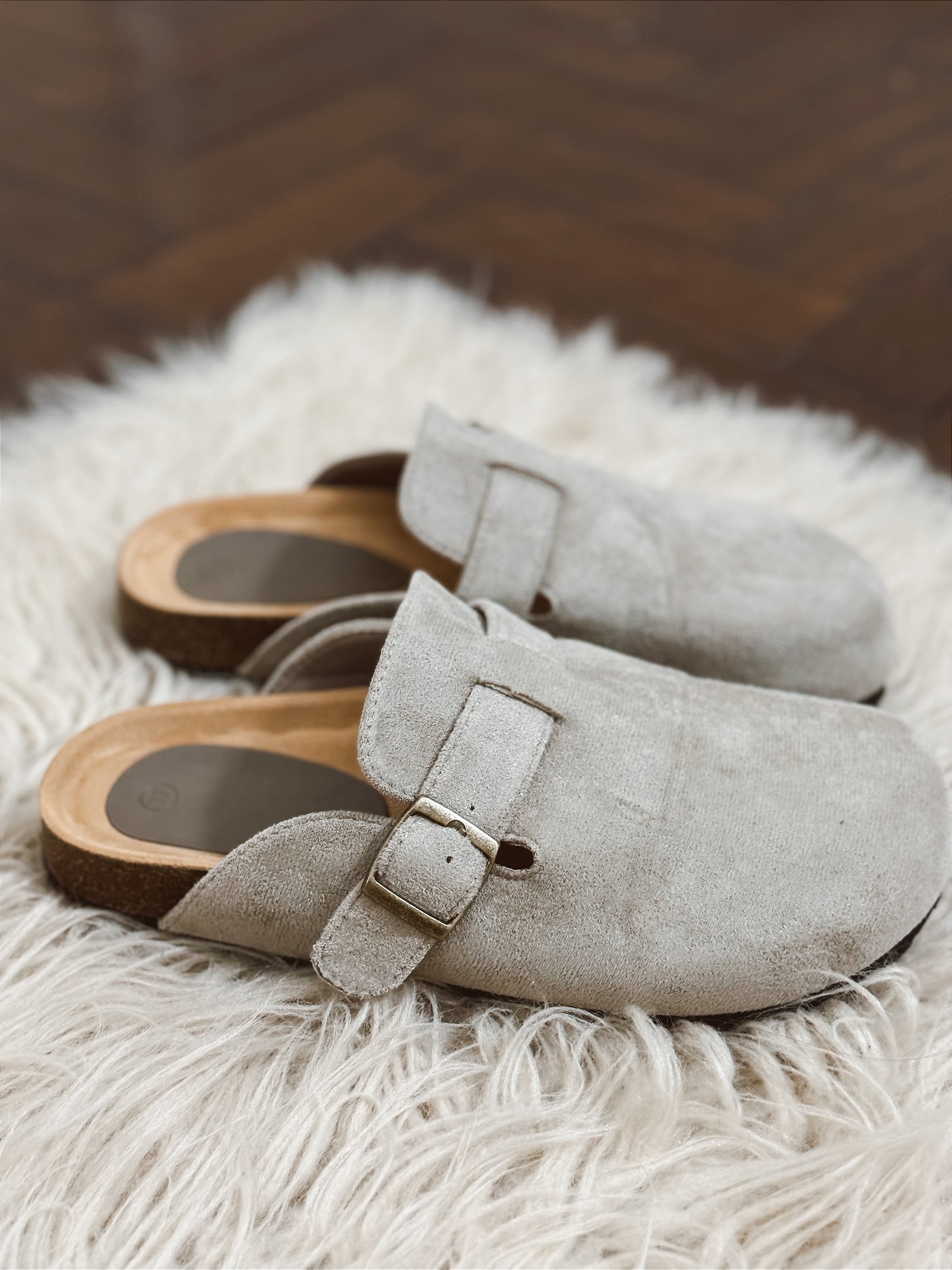 Sapato estilo tamanco, sem salto. Com cobertura em tecido aveludado.